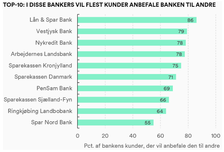 Tilfredsheden varierer fra bank til bank. Målt på anbefalinger vurderer bankkunderne, at Lån & Spar Bank er den bedste bank i 2024, efterfulgt af Vestjysk Bank og Nykredit Bank.