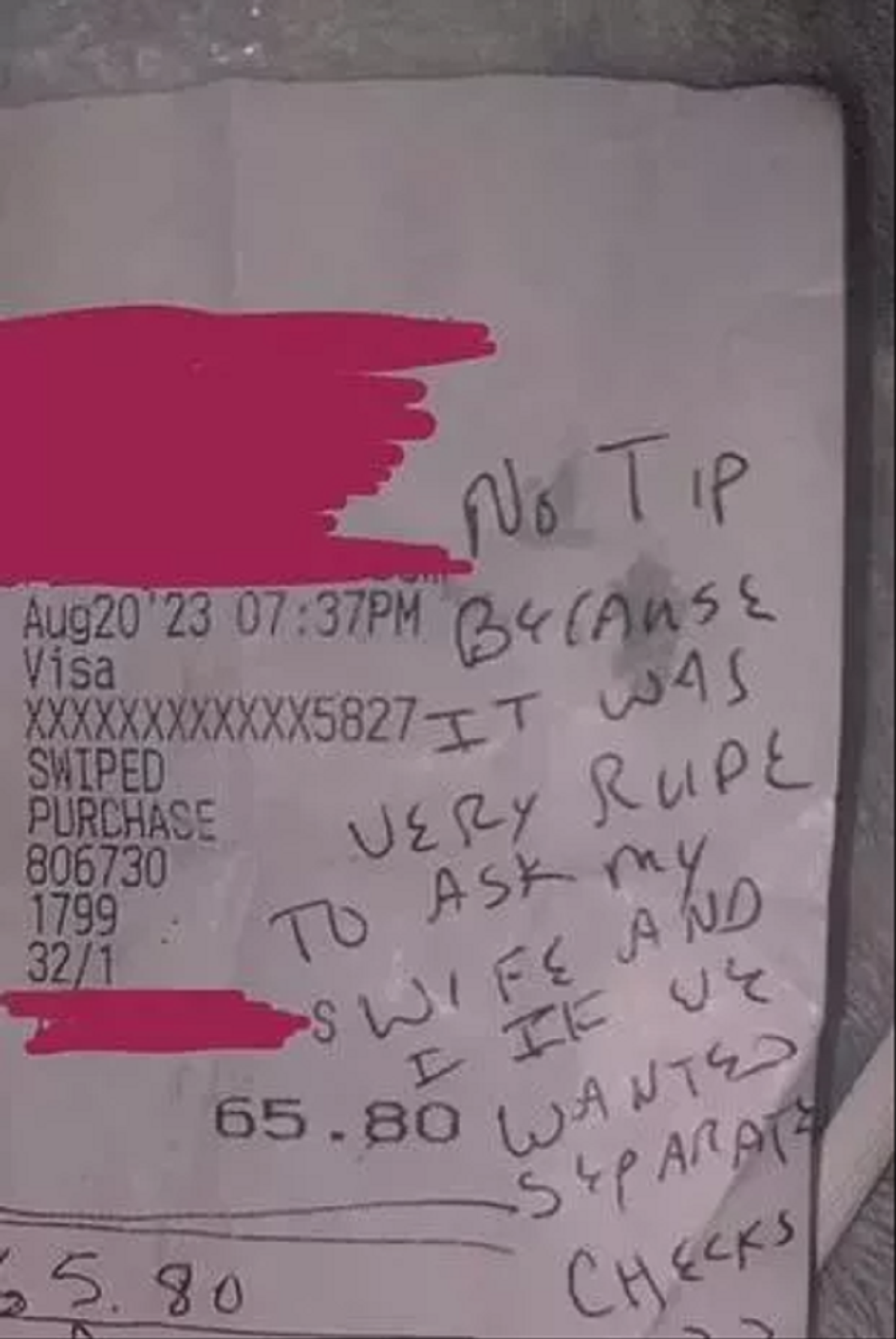 “Ingen drikkepenge, fordi det var meget uhøfligt at spørge min kone og mig, om vi ønskede separate regninger???”