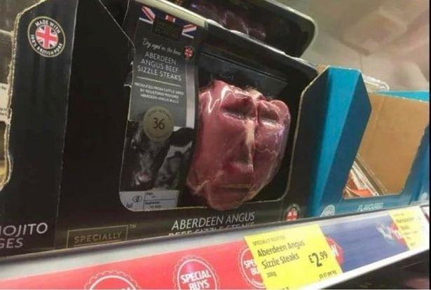 En Aberdeen Angus ‘sizzle’ steak, der sælges for omkring 28 kroner, blev fotograferet øverst på kødsækken i en Aldi-butik i Croydon, det sydlige England.