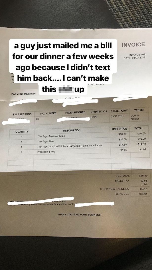 Nogle uger efter deres date modtog hun et brev fra manden. I stedet for at indeholde romantisk poesi eller smigrende komplimenter om aftenen indeholdt brevet en regning. Manden havde omhyggeligt listet alle Amanda Burnetts drikkevarer og madvarer op, som om han havde gemt dem til denne lejlighed.