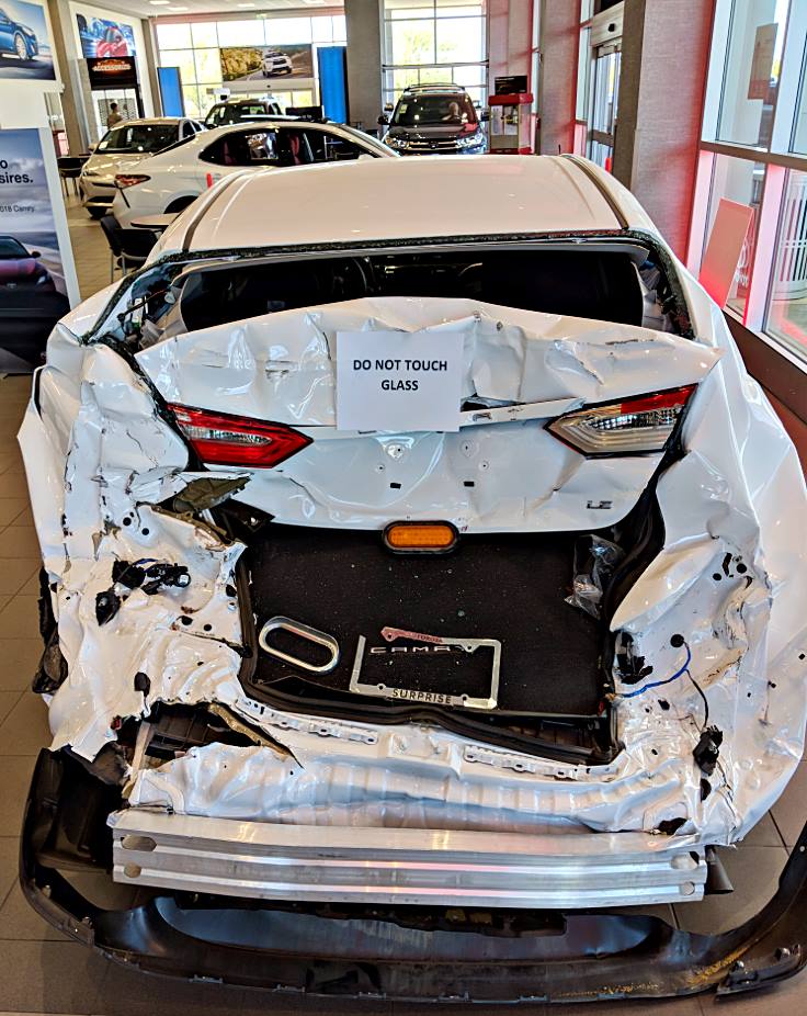 Forpartiet af bilen har undergået en voldsom deformation, med forlygterne og hele fronten bøjet indad, så det er umuligt at genkende, at det er en Toyota Camry.